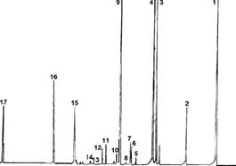 /мин): 1 - фенол; 2 - 2,6-диэтилфенол; 3 - 2-трет-бутил-4-метилфенол; 4 - 2,6-дитрет-бутилфенол; 5 - 4-трет-бутилфенол; 6 - 2-метил-4-пропилфенол; 7 - 4-втор-бутилфенол; 8 - 2,5-диэтилфенол; 9 - 4-изобутилфенол; 10 - 2,3,5,6-тетраметилфенол; 11 - 4-бутилфенол; 12 - 3-бутилфенол; 13 - 2-этил-4,5-диметилфенол; 14 - 3,4-диэтилфенол; 15 - 2-этил-5-пропилфенол; 16 - 2,4-дитрет-бутилфенол; 17 - 2,4,6-тритрет-бутилфенол