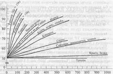 Формирование установки на обучение (см. 3.3.3) также позволило выявить различия в способности к обучению у животных разных видов, коррелирующие с уровнем развития мозга (рис. 1).