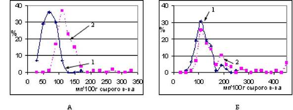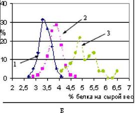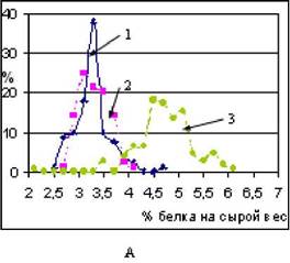 Так, не смотря на внешнее сходство кривых распределения белка, соответствующих 1996-му и 1997-му годам изучения, анализ данных по отдельным растениям показал, что внутри популяций произошли существенные изменения.
