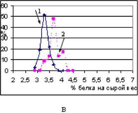 В каждой популяции были обнаружены растения, у которых содержание белка не менялось по годам (или менялись не более, чем на 5%). У сорта д-2 таких растений было 45%, что в 1,5 раза больше чем у сорта д-6 (28%). У сорта д-2 они располагались на графике в пределах концентраций от 2,9% до 3,7%, причем подавляющее число составляли растения с содержанием белка от 3,2 до 3,4%, что соответствовало количествам, близким к среднему по этой популяции. У сорта д-6, растения со стабильным в течение 2-х лет содержанием белка попадали на графике в диапазон от 3,2% до 4,1%. При этом подавляющее большинство составляли растения с показателями - от 3,6% до 3,8% белка на сухой вес, что также совпадает со средней концентрацией белка у популяции д-6 (рис. 1В).