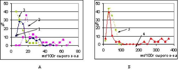 Рис .2. Внутрипопуляционная изменчивость люцерны по содержанию сапонинов. А -1996 год, Б -1997 год. Остальные обозначения как на рис. 1
