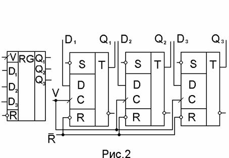 2.1. Устройство, называемое регистром, служит в основном для хранения чисел в двоичном коде при выполнении над ними различных арифметических и логических операций. С помощью регистров выполняютоя такие действия над числами, как передача их из одного устройства в другое, арифметический и логический сдвиг в сторону младших или старших разрядов, преобразование кода из последовательного в параллельный и наоборот и т.д. Функциональная схема и условно - графическое обозначение регистра параллельного типа, собранного на универсальных Д-триггерах, приведена на рис.2 .