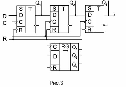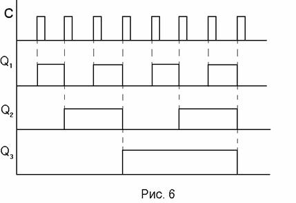 Каждый поступающий на вход счетчика импульс перебрасывает первый триггер в противоположное состояние (рис.6). Сигнал с инверсного выхода предыдущего триггера является входным сигналом для последующего и, таким образом, комбинация сигналов на выходах Q1, Q2, Q3 будет соответствовать числу поступивших на вход счетчика импульсов, представленному в двоичном коде. Счетчик данного типа называется асинхронным счетчиком.