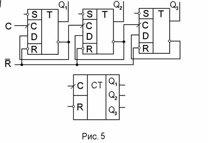 Функциональная схема и условнографическое обозначение двоичного счетчика с коэффициентом пересчета 23 представлена на рис.5.