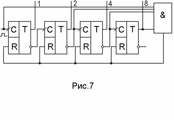 Для построения счетчика с требуемым коэффициентом пересчета М, отличным от величины 2N (N - число двоичных разрядов счетчика), используется принудительный сброс счетчика в исходное состояние при достижении счетчиком числа М. Пример такого счетчика с М=9 (М=10012) представлен на рис.7.
