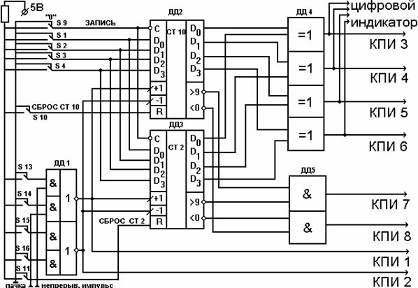 3.1. Функциональная схема исследуемого устройства представлена на рис.8 . Устройство включает двоично - десятичный счетчик ДД2, двоичный счетчик ДДЗ, коммутатор входных сигналов ДД1 и логические элементы ДД4 и ДД5, выполняющие функции элементов объединения.