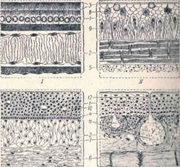 2) кориум с плотными рядами коллагеновых и эластических волокон, располагающихся правильными чередующимися слоями — продольным и вертикальным.