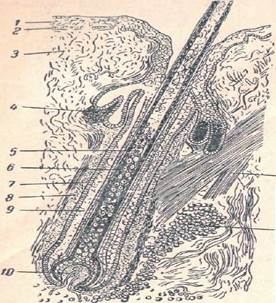 Рис. 7. Продольный разрез волоса в коже (по Паркеру): / — роговой слой Эпидермиса, 2 — его мальпигиев слой, 3 — собственно кожа, 4 — сальная железа, 5 — сердцевина волоса, в — корковое вещество волоса, 7 — стекловидная оболочка между влагалищем волоса и волосяным мешочком, 8 — волосяной мешочек, 9 — влагалище волоса, 10 — сосочек волоса с сосудами, // — жировая ткань, 12 — мышца волосяного мешочка