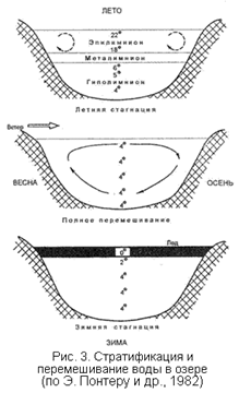 В стоячих водоемах (озерах) умеренных широт весной и осенью имеет место вертикальное перемешивание, и в эти сезоны температура во всем водоеме становится однородной, т.е. наступает гомотермия. Летом и зимой в результате резкого усиления прогревания или охлаждения верхних слоев перемешивание воды прекращается. Это явление называется температурной дихотомией, а период временного застоя – стагнацией (летней или зимней). Летом более легкие теплые слои остаются на поверхности, располагаясь над тяжелыми холодными (рис. 3). Зимой, наоборот, в придонном слое более теплая вода, так как непосредственно подо льдом температура поверхностных вод меньше +4°С и они в силу физико-химических свойств воды становятся более легкими, чем вода с температурой выше +4°С.