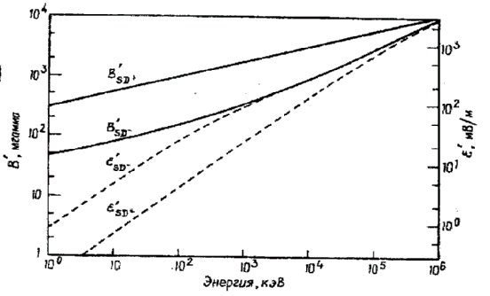 Рис. 1 Минимальные амплитуды флуктуирующих электрического и магнитного полей, необходимые для рассеяния протонов (+) или электронов (-) в режиме сильной диффузии на L=6. При других значениях L необходимые амплитуды изменяются как