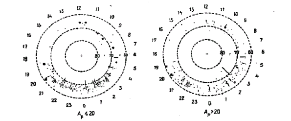 1.1.3. Явление, связанное с электростатической ионно-циклотронной волной. Большая часть (302 случая) выявленных событий имеет особенность, характерную для рассеяния частиц электростатическими ионно-циклотронными волнами: широкий интервал энергий изотропного потока высыпающихся электронов, сопровождающихся высыпанием ионов в режиме сильной диффузии. Как правило, такие высыпания имеют место вблизи верхнего предела значений L для области захваченных энергичных электронов, однако, заведомо в пределах внешней границы захвата, связанной с переходом в область незамкнутых геомагнитных силовых линий полярной шапки. Такие события сильно преобладают на ночной стороне в пределах интервала широт, характерного для овала полярных сияний (рис 2) (1). Это согласуется с процессом паразитного рассеяния высокоэнергичных электронов, которые переносятся градиентным дрейфом в зону постоянно существующей сильной турбулентности, связанной с ионными модами, на широтах ночного сектора овала полярных сияний. Смещение к экватору области высыпаний релятивистских электронов во время возмущений согласуется с установленным смещением овала полярных сияний во время суббурь.