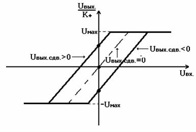 Наличие Uсм и Jсм приводит к возникновению в усилительном каскаде на этом ОУ выходного напряжения сдвига Uвых.сдв при нулевом входном сигнале. Амплитудные характеристики неинвертирующего усилителя при различных Uвых.сдв приведены на рис.3.8.