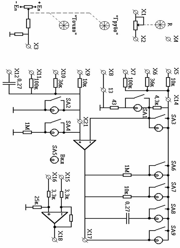 д) встроенный источник регулируемого постоянного напряжения, предназначенного для компенсации напряжения смещения усилителя (с возможностью грубой и плавной регулировки), расположенный в левой нижней части лицевой панели лабораторного макета.