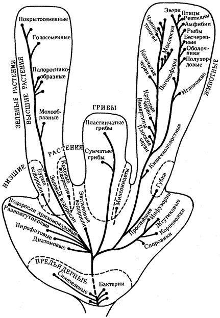 Рис. 2 Филогенетические отношения основных групп растений, грибов, животных и прокариот