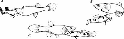 Самец кружится перед носом самки, демонстрируя яркую окраску хвостового и спинного плавников. Б. Сигмовидная поза у Poecilia reticulata. Самец принимает эту позу перед самкой и дрожит в течение нескольких секунд. Окраска самцов очень яркая и изменчивая. В. Попытка спариться у самца P. reticulata. После демонстрации окраски самец поворачивается кругом и пытается ввести гоноподий в генитальное отверстие самки. Оплодотворение внутреннее.