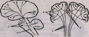 Мозолистое тело – дугообразная тонкая пластинка, филогенетически молодая, соединяет срединные поверхности обоих полушарий. Удлиненная средняя часть мозолистого тела сзади переходит в утолщение, а спереди искривляется и дугообразно загибается вниз. Мозолистое тело соединяет филогенетически наиболее молодые участки полушарий и играет важную роль в обмене информацией между ними.