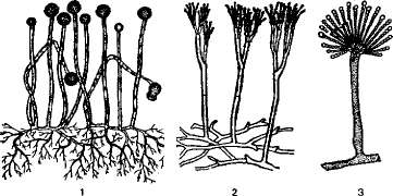 Рис. 6.1. Плесневые грибы: 1 — мукор; 2 — пеницилл; 3 — аспергилл.