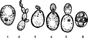 Рис. 6.2. Дрожжи: 1 — отдельная клетка; 2—5 — почкование клеток; б — сумка с четырьмя сумкоспорами.
