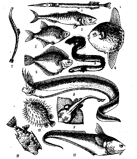 Рис. 1 - сарган; 2 - скумбрия; 3 - лещ; 4 - рыба-луна; 5 - камбала; 6 - угорь; 7 - рыба-игла; 8 - сельдяной король; 9 - скат; 10 - рыба-еж; 11 - кузовок; 12 - макрурус.