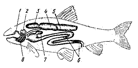 Рис. 4. Органы водного и воздушного дыхания у взрослых рыб: 1 - выпячивание ротовой полости; 2 - наджаберный орган; 3, 4, 5 - отделы плавательного пузыря; 6 - участки поглощения кислорода в кишечнике; 7 - выпячивание в желудке; 8 - жабры. |