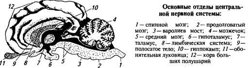 Центральная нервная система — это головной и спинной мозг. Головной мозг включает в себя задний мозг, или продолговатый мозг и варолиев мост, средний мозг, ретикулярную формацию, мозжечок, промежуточный мозг, лимбическую систему, подкорковые ядра, кору больших полушарий.