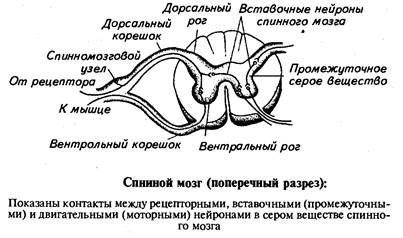 Спинной мозг расположен в позвоночном канале и представляет собой цилиндрический тяж с дорсальными и вентральными корешками. Он переходит в ствол головного мозга. Спинной мозг — структурно-физиологическое образование ЦНС из нейронов. Тела нейронов формируют серое вещество спинного мозга, а отростки нейронов — белое вещество. По физиологической роли различают три вида нейронов спинного мозга: промежуточные, моторные и вегетативные. Нейроны спинного мозга формируют исполнительные отделы нервных центров рефлекторных дуг рада рефлексов. Вентральные корешки называют двигательными, так как они содержат отростки двигательных нейронов, иннервирующие скелетные мышцы; дорсальные корешки — чувствительными: состоят из отростков рецепторных нейронов.
