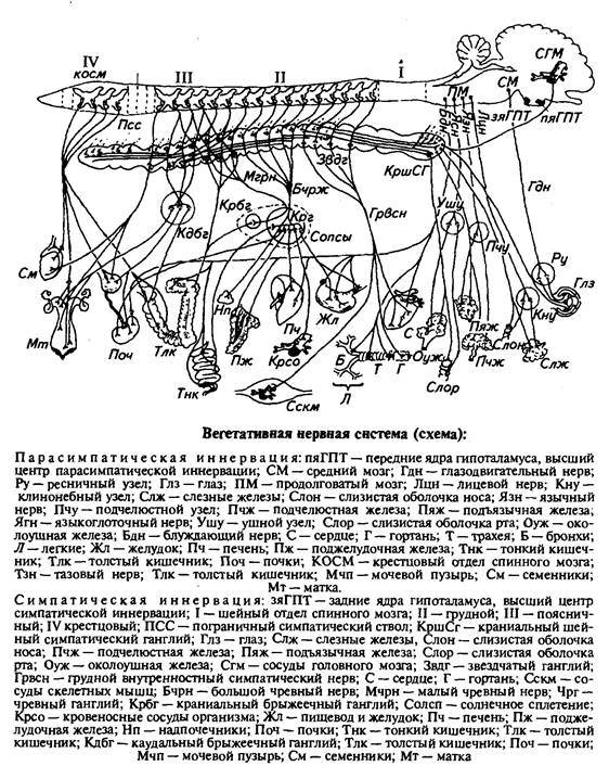Высшие нервные центры вегетативного отдела нервной системы находятся в гипоталамусе: в передних ядрах — центры парасимпатической иннервации, в задних ядрах — центры симпатической иннервации.
