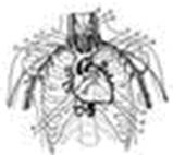 Рис. 1. Проекция сердца, створок и крупных сосудов на переднюю стенку грудной клетки (полусхематично): 1 — трахея; 2 — правая общая сонная артерия; 3 — плечеголовной ствол; 4 — подключичная артерия; 5 — подключичная вена; 6 — отверстие аорты (полулунные клапаны аорты); 7 — правое предсердно-желудочковое отверстие (трёхстворчатый клапан); 8 — наружная сонная артерия; 9 — внутренняя ярёмная вена; 10 — щитовидная железа; 11 — левая плечеголовная вена; 12 — дуга аорты; 13 — лёгочный ствол; 14 — бронхи; 15 — отверстие лёгочного ствола (клапан лёгочной артерии); 16 — левое предсердно-желудочковое отверстие (митральный клапан); 17 — верхушка сердца.