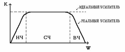 Резисторные усилительные касакады широко применяются в различных областях радиотехники. Идеальный усилитель имеет равномерную АЧХ во всей полосе частот, реальный усилитель всегда имеет искажения АЧХ, прежде всего - снижение усиления на низких и высоких частотах, как показано на рис. 3.1.