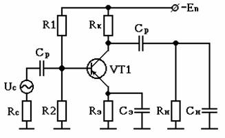 Схема резисторного усилителя переменного тока на биполярном транзисторе по схеме с общим эмиттером представлена на рис. 3.2, где Rc - внутреннее сопротивление источника сигнала Uc ; R1 и R2 - сопротивления делителя, задающие рабочую точку транзистора VT1; Rэ - сопротивление в цепи эмиттера, которое шунтируется конденсатором Сэ ; Rк - коллекторное сопротивление; Rн - сопротивление нагрузки; Cp - разделительные конденсаторы, обеспечивающие разделение по постоянному току транзистора VT1 от цепи сигнала и цепи нагрузки.