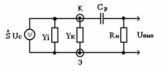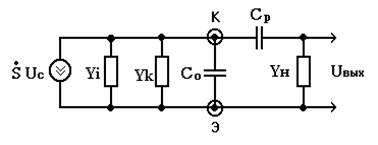 Эквивалентная схема выходной цепи усилителя по схеме рис.3.2 представлена на рис. 3.3, где: S - крутизна трагзистора, Uc - входной сигнал, Yi = Y22 - выходная проводимость транзистора, Yк =1/Rк - коллекторная проводимость , Со = Свых + См + Сн , Свых - выходная емкость транзистора, См - распределенная паразитная и монтажная емкости, Сн - емкость нагрузки, Ср - разделительный конденсатор, Yн = 1/Rн - проводимость нагрузки. Отметим, что обычно в усилителях проводимости Yi < Yн <Yк (1/Yi > Rн > Rк).