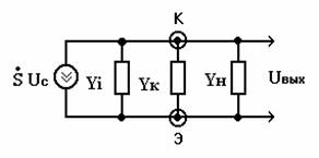 Эквивалентная схема получена с учетом того, что на переменном токе шина питания (“-Еп”) и общая точка (“земля”) являются короткозамкнутыми, а также с учетом допущения 1/wCэ << Rэ , когда можно считать эмиттер VT1 подключенным на переменном токе к общей точке.