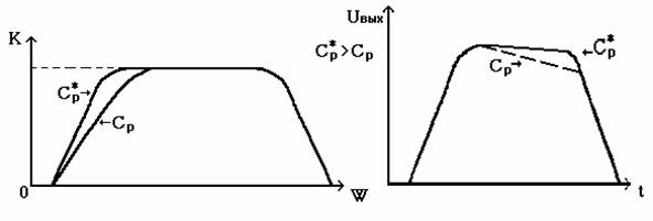 Чем ниже частота сигнала w , тем больше емкостное сопротивление Ср (1/wCр ), и тем меньшая часть напряжения попадает на выход, в результате чего происходит снижение усиления. Таким образом, Ср определяет поведение АЧХ усилителя в области НЧ и практически не оказывает влияния на АЧХ усилителя в области средних и высоких частот. Чем больше Ср, тем менбше искажения АЧХ в области НЧ, а при усилении импульсных сигналов - тем меньше искажения импульса в области больших времен (спад плоской части вершины импульса), как показано на рис.3.6.