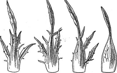 Рис. 274. Серия стеблевых листьев пиона (1—5} и верховые листья и чашелистики пиона (6—13}.