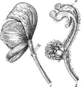 Образование шпорцев. В связи со специализированным опылением находятся и многочисленные случаи образования шпорцев в семействах лютиковых, маковых, фиалковых, бальзаминовых, орхидных и др. Шпорец представляет обычно полый орган и возникает из лепестка или листочка простого околоцветника. На ранних этапах развития появляется мешковидное выпячивание, в дальнейшем удлиняющееся. Филогенетически эта первая стадия закреплена у львиного зева , тогда как у близкородственных льнянок существуют уже настоящие шпорцы . Возникновение шпорцевых образований, как уже сказано, стоит в тесной связи с выделением нектара. Последний отделяется стенкой самого шпорца или находящимися внутри шпорца нектар-ничками.
