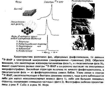 2. Исследование бислоев методом пР-ЯМР. Этот метод также используется для структурной характеристики гидратирован-ных липидов. Например, фосфолипиды в гексагональной фазе Ни дают спектры 31Р-ЯМР, резко отличающиеся от спектров фосфолипидов в ламеллярной фазе. С помощью этого метода исследовался переход ламеллярной фазы в гексагональную в липидах и липидных смесях. Недостатком метода является некоторая неопределенность при интерпретации спектров в случае изотропного усреднения за счет относительно быстрых движений. Полагают, что такой спектр отвечает структурам типа «липидных частиц», однако это объяснение не является единственно возможным. Как было показано, метод 31Р-ЯМР позволяет надежно установить наличие гексагональной Ни-фазы в чисто липидных дисперсиях, но в случае биологических мембран к подобным выводам следует относиться с осторожностью, особенно если они не подтверждены другими методами.