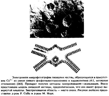 Электронно-микроскопические методы использовались также для изучения «липидных частиц». Эти частицы нередко наблюдаются в бинарных смесях, если один из липидов склонен образовывать фазу Ни, а другой — бислойные структуры. Липидные частицы образуются в чисто липидных образцах и потому отличаются от «белковых частиц», которые наблюдаются в биологических мембранах и в реконструированных белково-липид-ных системах. Было высказано предположение, что липидные частицы представляют собой вывернутые мицеллы, расположенные внутри бислоя, и что они играют определенную роль в биологических процессах, облегчая слияние мембран или стабилизируя их на сильно искривленных участках, как, например, в мем^ бране тилакоидов. Однако четких доказательств биологической роли липидных частиц пока не получено.