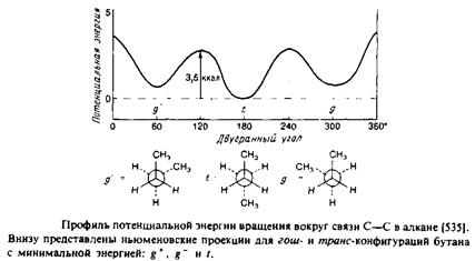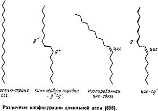 Рассмотрим сначала насыщенные углеводородные цепи. В них возможно свободное вращение вокруг каждой С—С-связи, характеризующееся энергетическим минимумом, особенно четким в случае ньюменовской проекции. Наиболее стабильна транс-конфигурация, при этом высота энергетического барьера для перехода через заслоненную конфигурацию в гош-форму составляет по оценкам 3,5 ккал/моль. В полностью m/wwc-конфигурации цепь максимально вытянута и не меняет своего направления, тогда как в гош-конформации ее направление меняется. Последовательность гош-транс-гош для трех смежных С—С-связей приводит к появлению в цепи излома, в результате чего участки цепи выше и ниже места излома оказываются значительно смещенными друг относительно друга. /ош-конфигурация в зависимости от направления вращения при переходе от Q к С4 обозначается как g+ или g". Кинки типа g + tg~ или g~ tg+ приводят к минимальному сдвигу цепи. Почти все двойные связи в мембранных липидах находятся в J/ис-конфигурации. Как и в случае гош-конфигурации, это приводит к изменению общего направления цепи. Наличие в углеводородных цепях кинков, двойных ^ыс-связей,