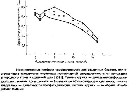 На рис. приведены параметры упорядоченности, определенные по данным 2Н-ЯМР для нескольких селективно дейтерирован-ных фосфолипидов, в которых атом дейтерия включен в определенные метиленовые группы sn-1-пальмитоильного остатка. Исследовались как липидные бислои, так и природные мембраны, находящиеся в жидкокристаллическом состоянии, поскольку в случае фазы геля спектры очень уширяются из-за плотной упаковки липидов и потому с трудом поддаются анализу. Эти данные позволяют сделать два вывода.
