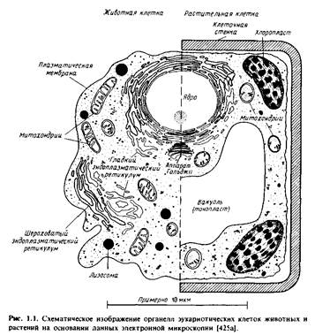 Эукариотические клетки содержат различные мембранные орга-неллы, причем каждая мембрана уникальна по своему составу, особенностям структурной организации и по характеру выполняемых функций. Для того чтобы понять мотивы исследований, описанных в последующих главах, необходимо получить некоторые общие представления о биологических функциях различных мембранных систем. На рис.1.1 схематически изображены мембраны, обычно представленные в животной и растительной клетках. Заметим, что внешний вид органелл неодинаков в клетках разного типа. Кроме того, некоторые клетки, например палочки сетчатки, а также клетки скелетных мышц, имеют высокоспециализированные мембраны, выполняющие уникальные функции.