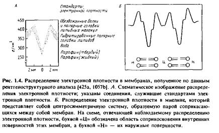 При исследовании высокоупорядоченных кристаллических образцов с помощью метода дифракции рентгеновских лучей удается получить информацию о структуре с высоким разрешением. В случае же малоупорядоченных препаратов возможности этого метода ограничены. Некоторые специализированные мембранные системы уже имеют регулярную структуру, и потому их можно изучать рентгено-структурными методами. Примером такого рода служит миелиновая оболочка периферических нервных волокон; она представляет собой мембрану, которая, многократно оборачиваясь вокруг аксона, формирует регулярную систему из концентрических мембранных структур. Исследования дифракции рентгеновских лучей на миелине, проведенные еще в 30-х гг., подтверждают адекватность бислойной модели мембран. К такому же выводу приводит и изучение наружного сегмента палочек сетчатки позвоночных, которые представляют собой природные упорядоченные мембранные системы, а также искусственно упорядоченных систем, которые образуются при коллапсировании в условиях центрифугирования мембранных везикул, полученных из митохондрий и эритроцитов. Во всех этих случаях наблюдалось сходное распределение электронной плотности в мембране, показанное на рис.1.4