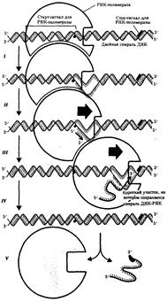 I - обнаружение промоторной области в молекуле ДНК и раскручивание спирали ДНК; II - инициация синтеза цепи РНК путем связывания двух первых рибонуклеозидгрифосфатов; III - наращивание цепи РНК в направлении 5' → 3' путем присоединения рибонуклеозидгрифосфатов; IV - высвобождение 5'-конца синтезируемой РНК и восстановление двойной спирали ДНК; V - окончание синтеза РНК в области терминатора, отделение полимеразы от завершенной цепи РНК