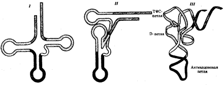 I - вторичная структура тРНК в виде "клеверного листа", определяемая ее первичной структурой (последовательностью нуклеотидов в цепи);