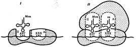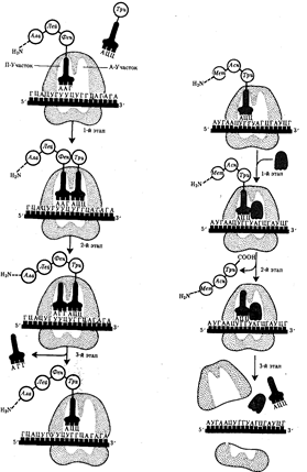 Благодаря особенностям трехмерной организации тРНК при соединении ее антикодона с кодоном мРНК. транспортируемая ею аминокислота располагается в А-участке, поблизости от ранее включенной аминокислоты, находящейся в П-участке. Между двумя аминокислотами образуется пептидная связь, катализуемая особыми белками, входящими в состав рибосомы. В результате предыдущая аминокислота теряет связь со своей тРНК и присоединяется к аминоацил-тРНК, расположенной в А-участке. Находящаяся в этот момент в П-участке тРНК высвобождается и уходит в цитоплазму (рис.33). Перемещение тРНК, нагруженной пептидной цепочкой, из А-участка в П-участок сопровождается продвижением рибосомы по мРНК на шаг, соответствующий одному кодону. Теперь следующий кодон приходит в контакт с А-участком, где он будет специфически "опознан" соответствующей аминоацил-тРНК, которая разместит здесь свою аминокислоту. Такая последовательность событий повторяется до тех пор, пока в А-участок рибосомы не поступит кодон-терминатор, для которого не существует соответствующей тРНК.