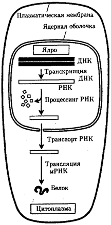 Рис. 35. Обобщенная схема процесса экспрессии генетической информации в эукариотической клетке