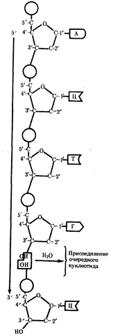 Сборка полинуклеотидной цепи осуществляется при участии фермента полимеразы, который обеспечивает присоединение фосфатной группы следующего нуклеотида к гидроксильной группе, стоящей в положении 3', предыдущего нуклеотида (рис. 3.3). Благодаря отмеченной специфике действия названного фермента наращивание полинуклеотидной цепи происходит только на одном конце: там, где находится свободный гидроксил в положении 3'. Начало цепи всегда несет фосфатную группу в положении 5'. Это позволяет выделить в ней 5' и 3 '-концы.