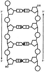 Другой важной особенностью объединения двух полинуклеотидных цепей в молекуле ДНК является их антипараллельность: 5'-конец одной цепи соединяется с 3'-концом другой, и наоборот (рис.4).