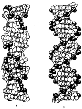Рис.5. Пространственные модели левозакрученной Z-формы (I) и правозакрученной В-формы (II) ДНК