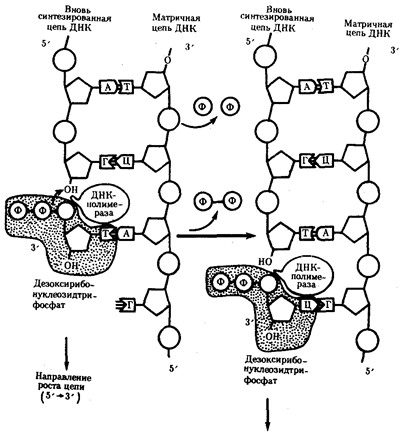 Рис.10. Присоединение очередного нуклеотида к дочерней цепи ДНК, синтезируемой при участии ДНК-полимеразы: ФФ-пирофосфат