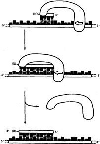 Такие ошибки в работе ДНК-полимеразы связаны с возникновением измененных форм азотистых оснований, которые образуют "незаконные" пары с основаниями материнской цепи. Например, измененная форма цитозина вместо гуанина связывается водородными связями с аденином. В результате в растущую цепь ДНК включается ошибочный нуклеотид. Быстрый переход измененной формы такого основания в обычную нарушает его связывание с матрицей, появляется неспаренный 3'-ОН-конец растущей цепи ДНК. В этой ситуации включается механизм самокоррекции, осуществляемый ДНК-полимеразой (или тесно связанным с ней ферментом - редактирующей эндонуклеазой). Самокоррекция заключается в отщеплении ошибочно включенного в цепь ДНК нуклеотида, не спаренного с матрицей (рис.14). Следствием самокоррекции является снижение частоты ошибок в 10 раз (с 10-5 до 10-6).